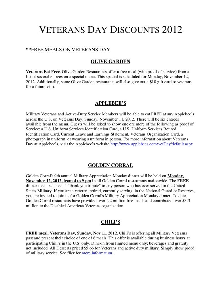 Veterans Day Free Meals Or Discounts For Military Veterans